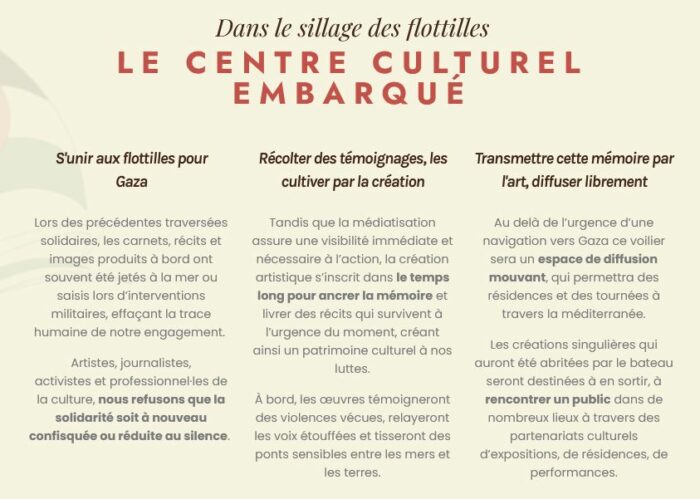 Nous lançons aujourd’hui un appel solidaire pour faire émerger un navire qui deviendra le Centre Culturel Embarqué : un lieu de création, de préservation et de transmission reliant les flottilles aux territoires palestiniens. Imaginons un voilier conçu comme un atelier mouvant, un musée flottant, un refuge pour les mémoires et un espace de co-construction artistique entre créateur·ices embarqué·es et artistes de Palestine.